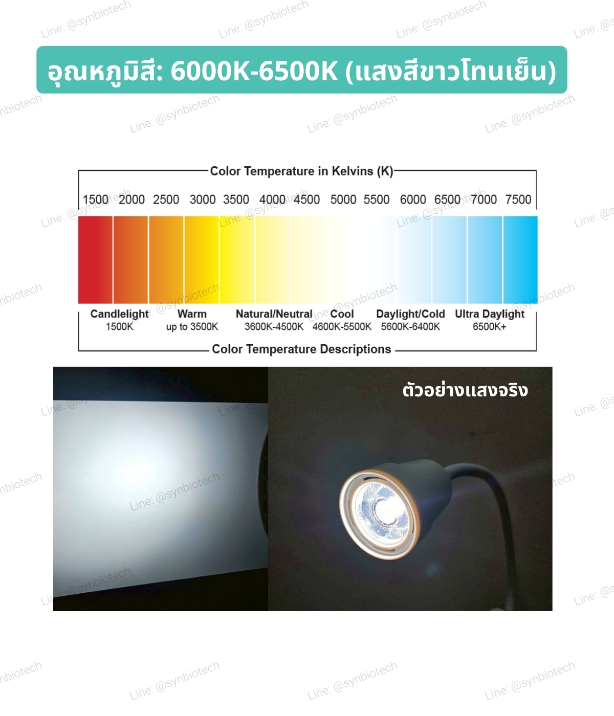 4. แสงสว่างคมชัด: ให้แสงสีขาว (Daylight) ที่ อุณหภูมิ 6,000-6,500 เคลวิน และความสว่าง 650-750 ลูเมน