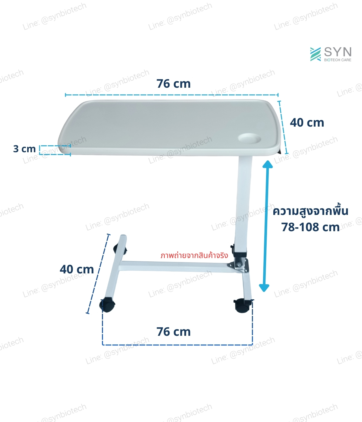 1. โต๊ะขนาดโดยรวม ยาว X กว้าง X สูง = 76 X 40 X 78 – 108 cm.
