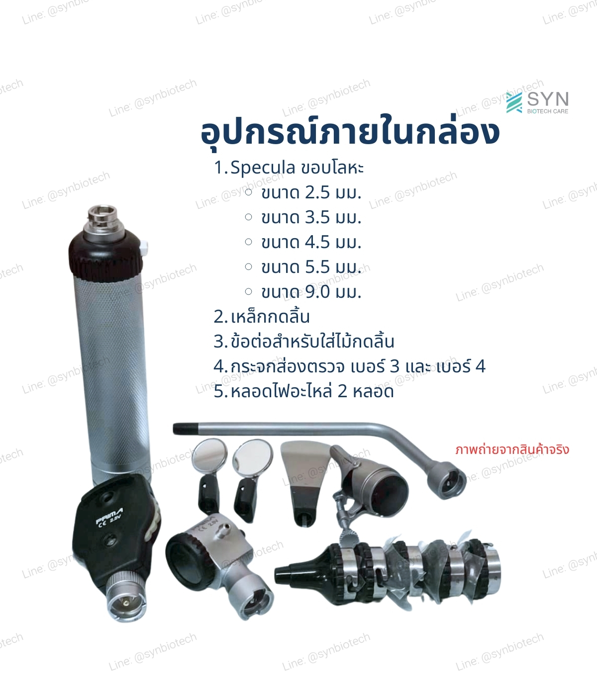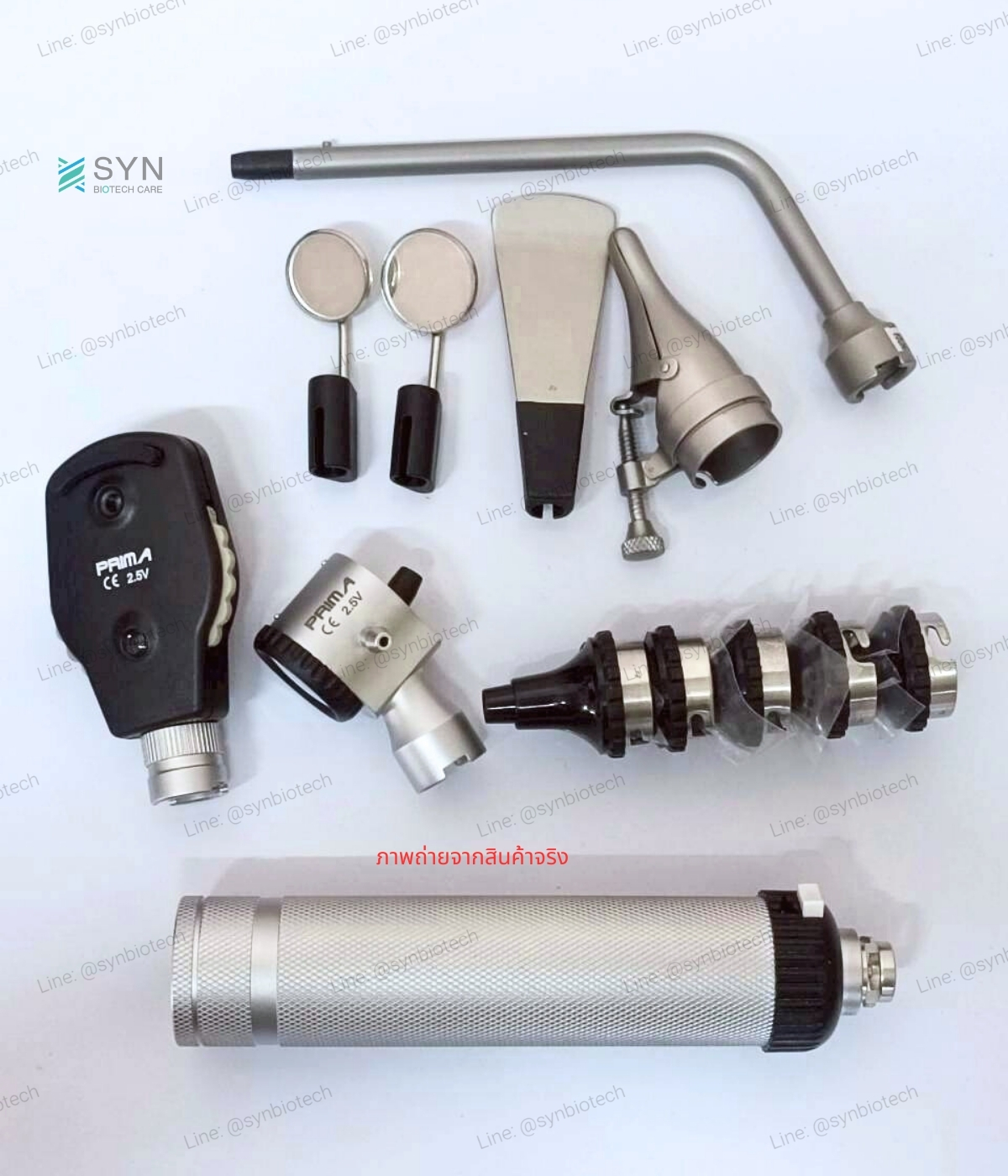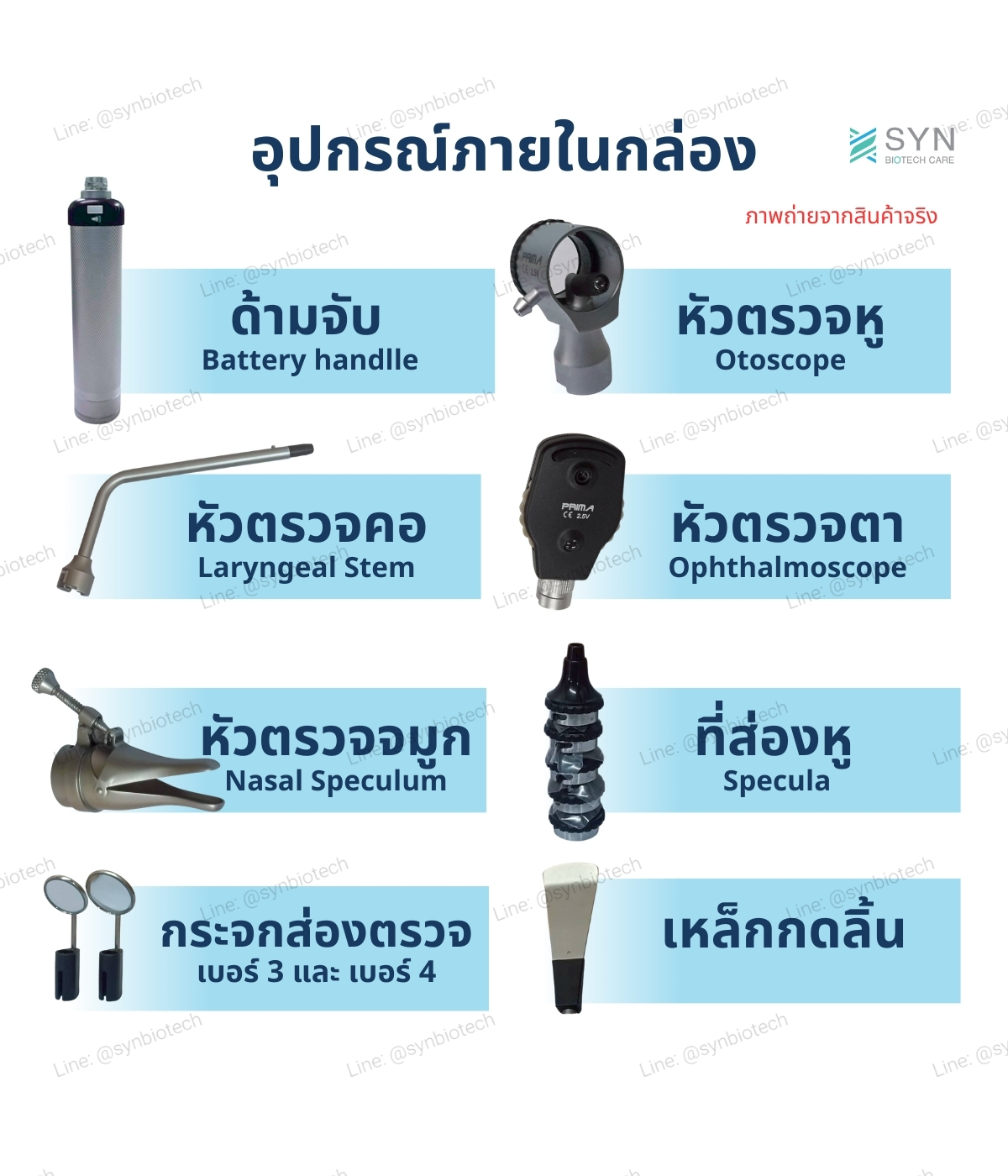 หัวตรวจตา (Ophthalmoscope), หัวตรวจหู (Otoscope), หัวตรวจคอ (Laryngeal Stem), หัวตรวจจมูก (Nasal Speculum), ด้ามจับ (Handle) และกล่องใส่ (Case)