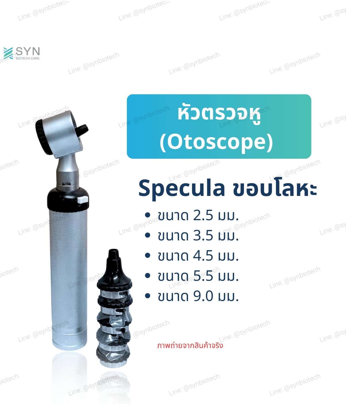 หัวตรวจหู (Otoscope) ใช้หลอดไฟสูญญากาศ (Vacuum) 2.5V มีเลนส์ส่องตรวจขนาดใหญ่ กำลังขยาย 3 เท่า สามารถถอดเลนส์ออกได้