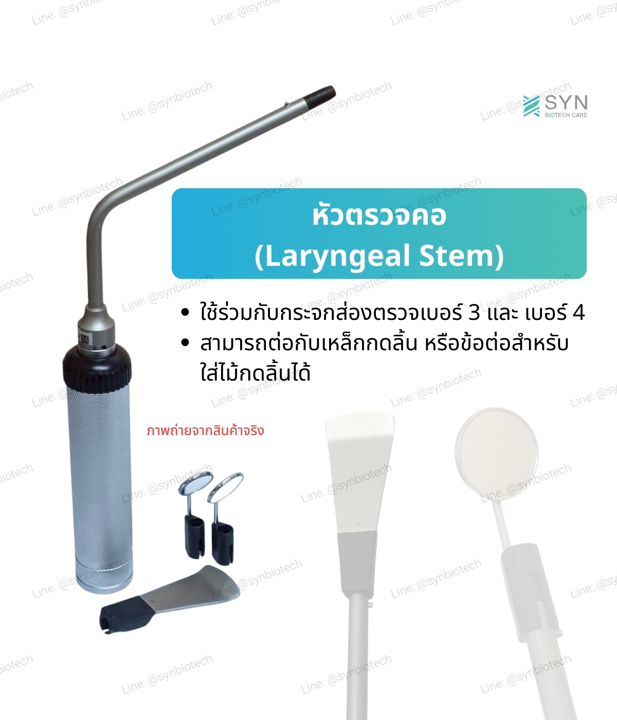 หัวตรวจคอ (Laryngeal Stem) ใช้ร่วมกับกระจกส่องตรวจเบอร์ 3 และ เบอร์ 4 สามารถต่อกับเหล็กกดลิ้น หรือข้อต่อสำหรับใส่ไม้กดลิ้นได้