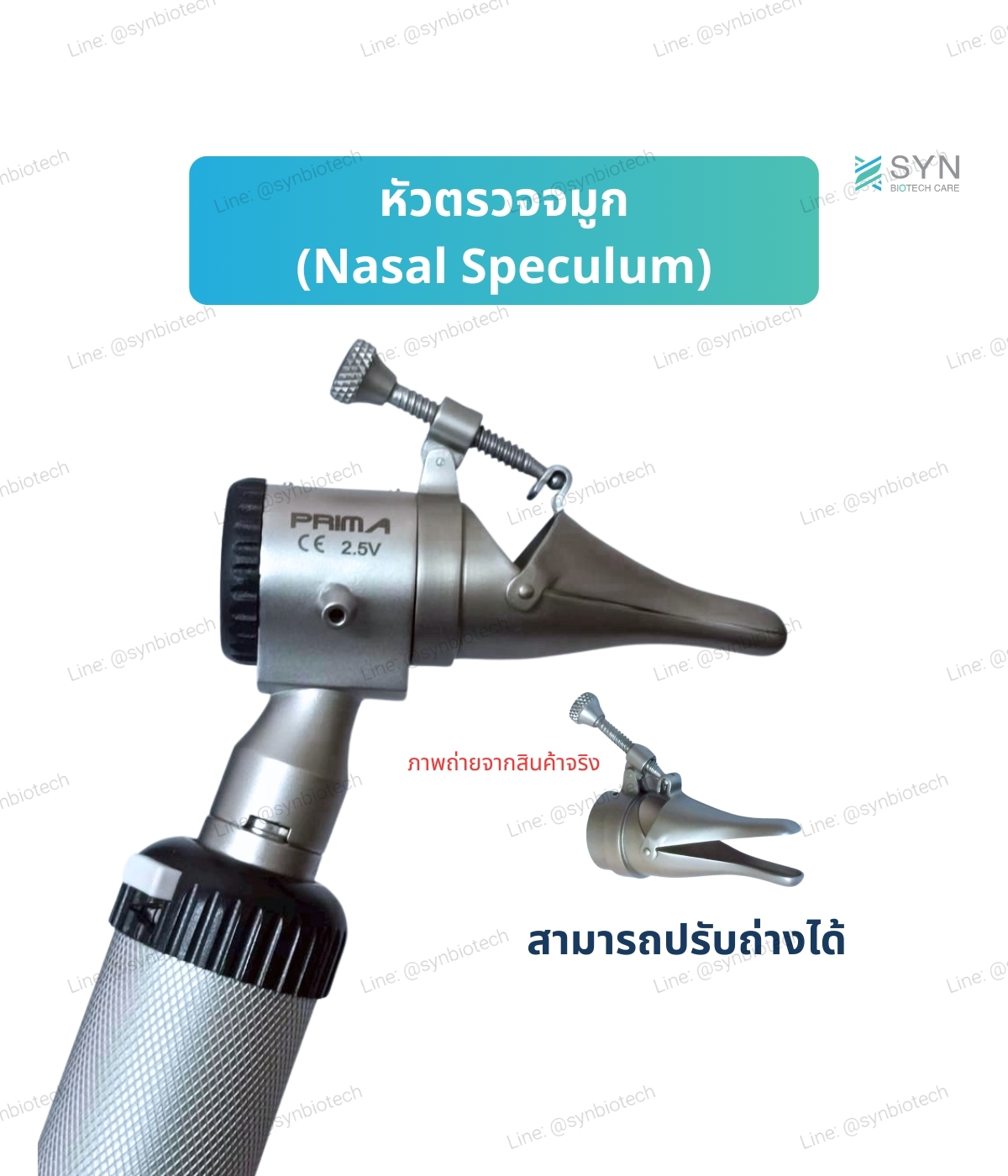หัวตรวจจมูก (Nasal Speculum) สามารถปรับถ่างได้ 5. ด้ามทำด้วยโลหะไม่เป็นสนิม สามารถหมุนปรับความสว่างได้